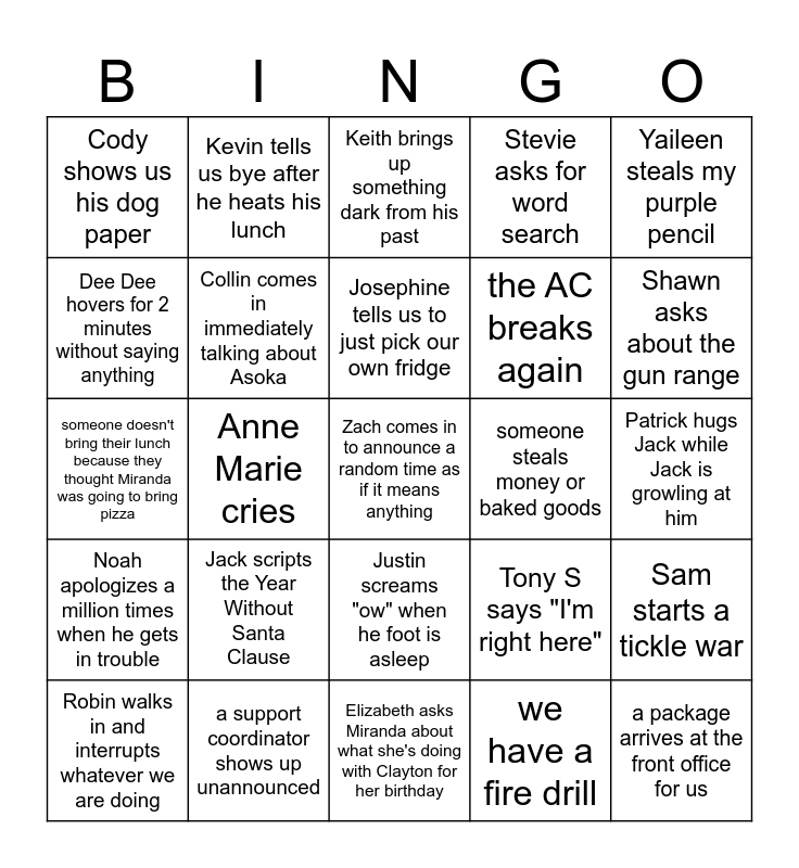 This bingo card has 25 words: Jack scripts the Year Without Santa Clause, Elizabeth asks Miranda about what she's doing with Clayton for her birthday, Josephine tells us to just pick our own fridge, Robin walks in and interrupts whatever we are doing, Yaileen steals my purple pencil, Cody shows us his dog paper, Dee Dee hovers for 2 minutes without saying anything, Kevin tells us bye after he heats his lunch, someone steals money or baked goods, Justin screams "ow" when he foot is asleep, the AC breaks again, someone doesn't bring their lunch because they thought Miranda was going to bring pizza, Tony S says "I'm right here", Sam starts a tickle war, Collin comes in immediately talking about Asoka, a package arrives at the front office for us, Patrick hugs Jack while Jack is growling at him, Keith brings up something dark from his past, Shawn asks about the gun range, Anne Marie cries, Zach comes in to announce a random time as if it means anything, a support coordinator shows up unannounced, Noah apologizes a million times when he gets in trouble, Stevie asks for word search and we have a fire drill.