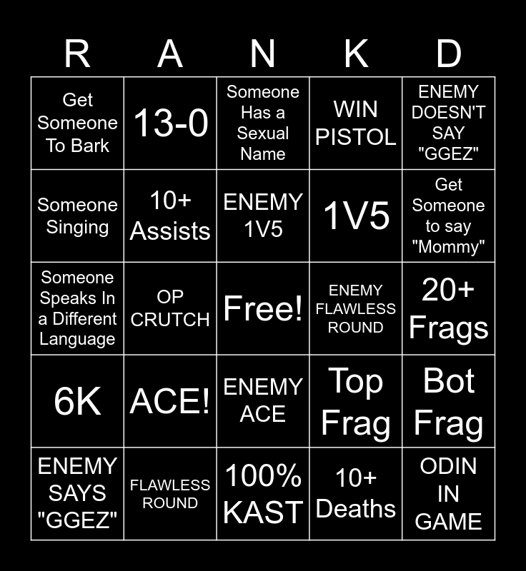 This bingo card has a free space and 24 words: ACE!, FLAWLESS ROUND, ENEMY 1V5, ENEMY SAYS "GGEZ", ENEMY DOESN'T SAY "GGEZ", Get Someone To Bark, Someone Singing, 13-0, ENEMY FLAWLESS ROUND, ENEMY ACE, 1V5, Someone Speaks In a Different Language, Top Frag, Bot Frag, 10+ Assists, 10+ Deaths, 20+ Frags, Someone Has a Sexual Name, Get Someone to say "Mommy", OP CRUTCH, ODIN IN GAME, 6K, WIN PISTOL and 100% KAST.