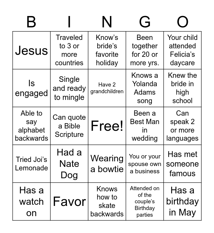 This bingo card has a free space and 39 words: Lived in Maryland, Newly-weds, Attended church with Stevensons, You or your spouse own a business, Has met someone famous, Tried Joi’s Lemonade, Can quote a Bible Scripture, Has traveled over 1 hr to get here, Been a Best Man in wedding, Can speak 2 or more languages, Is engaged, Traveled to 3 or more countries, Own a pet besides a cat or dog, Knew the bride in high school, Able to say alphabet backwards, Had a Nate Dog, Wearing a bowtie, Been together for 20 or more yrs., Got married in the same month as the Bride and Groom, Has a watch on, Single and ready to mingle, Have 2 grandchildren, Attended on of the couple’s Birthday parties, Your child attended Felicia’s daycare, Know where grooms grew up, Favor, Knows how to skate backwards, Faith, Love, Jesus, Knows where bride grew up, Lives in same town as bride and groom, Knows a Yolanda Adams song, Has a birthday in May, Has 4+ siblings, Knows the names all bride and groom children, Know’s bride’s favorite holiday, Knows grooms middle name and Watched The Color Purple.