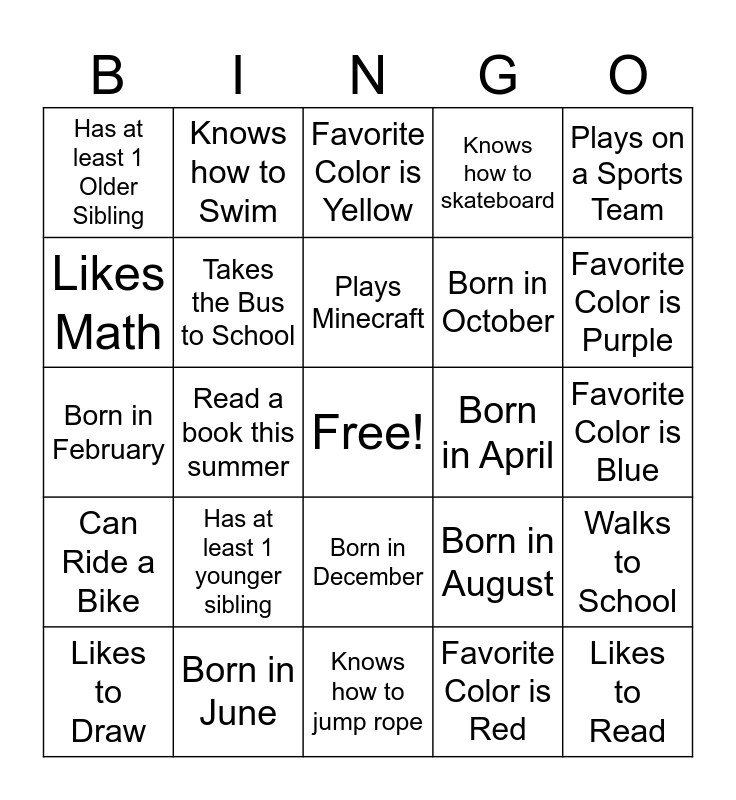 This bingo card has a free space and 24 words: Has at least 1 younger sibling, Born in June, Plays Minecraft, Likes to Draw, Plays on a Sports Team, Has at least 1 Older Sibling, Likes Math, Knows how to Swim, Born in April, Born in December, Born in October, Born in February, Born in August, Walks to School, Takes the Bus to School, Favorite Color is Red, Favorite Color is Blue, Favorite Color is Yellow, Favorite Color is Purple, Read a book this summer, Likes to Read, Can Ride a Bike, Knows how to skateboard and Knows how to jump rope.