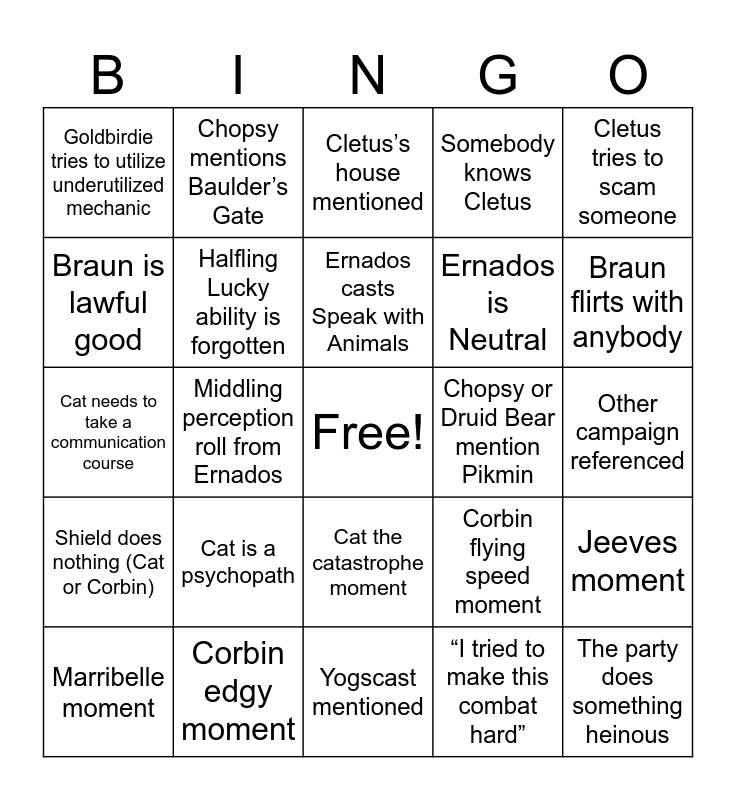 This bingo card has a free space and 24 words: Cat is a psychopath, Corbin edgy moment, Ernados casts Speak with Animals, Marribelle moment, Cletus tries to scam someone, Goldbirdie tries to utilize underutilized mechanic, Braun is lawful good, Chopsy mentions Baulder’s Gate, Chopsy or Druid Bear mention Pikmin, Cat the catastrophe moment, Ernados is Neutral, Cat needs to take a communication course, Corbin flying speed moment, Jeeves moment, Halfling Lucky ability is forgotten, “I tried to make this combat hard”, Other campaign referenced, Cletus’s house mentioned, Braun flirts with anybody, Middling perception roll from Ernados, The party does something heinous, Shield does nothing (Cat or Corbin), Somebody knows Cletus and Yogscast mentioned.