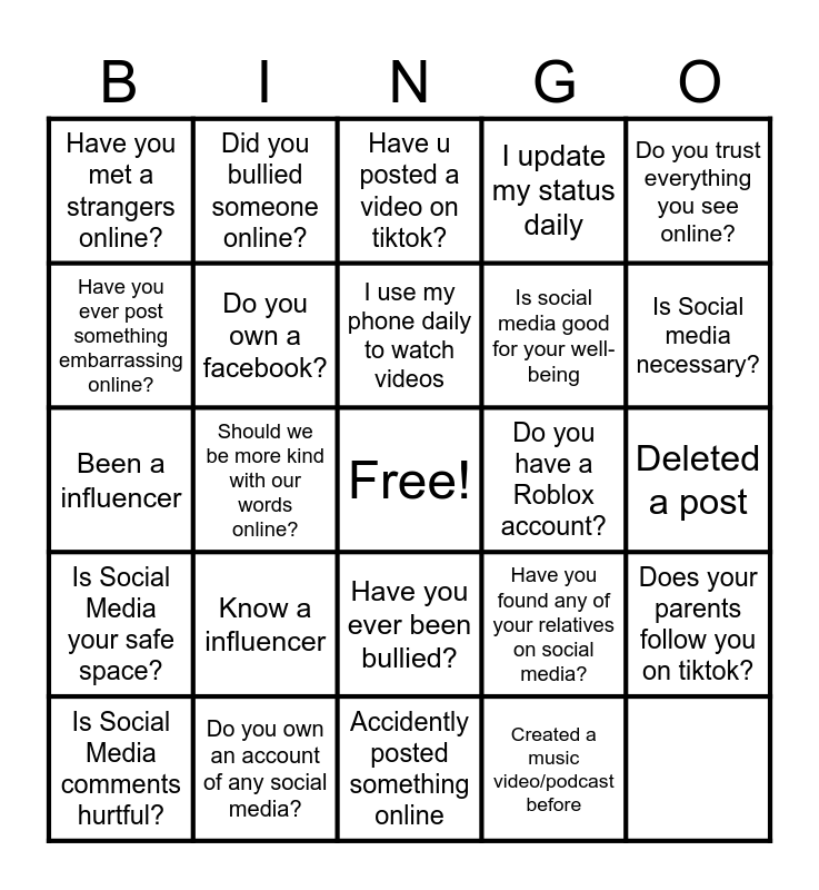 This bingo card has a free space and 24 words: Is Social Media your safe space?, Do you own an account of any social media?, Have you ever been bullied?, Have you found any of your relatives on social media?, Do you trust everything you see online?, Have you met a strangers online?, Did you bullied someone online?, Have u posted a video on tiktok?, Is social media good for your well-being, Does your parents follow you on tiktok?, Have you ever post something embarrassing online?, Do you own a facebook?, Do you own a twitter?, Do you have a Roblox account?, Is Social media necessary?, Is Social Media comments hurtful?, Should we be more kind with our words online?, I use my phone daily to watch videos, I update my status daily, Deleted a post, Been a influencer, Know a influencer, Accidently posted something online and Created a music video/podcast before.