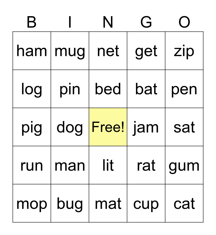 This bingo card has a free space and 29 words: bus, bug, net, hat, zip, ham, pin, bed, jam, gum, mop, dog, cup, cat, pig, map, mat, rat, pen, run, man, sun, bat, sat, log, mug, lit, get and van.