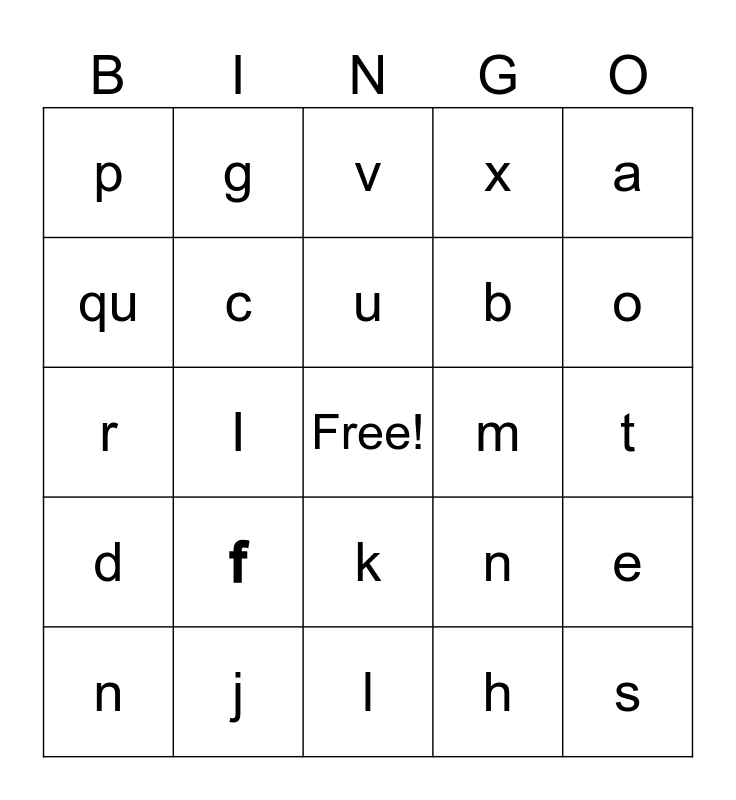 This bingo card has a free space and 24 words: f, j, u, n, a, p, qu, g, m, k, b, r, n, e, c, h, t, v, o, I, s, d, x and l.
