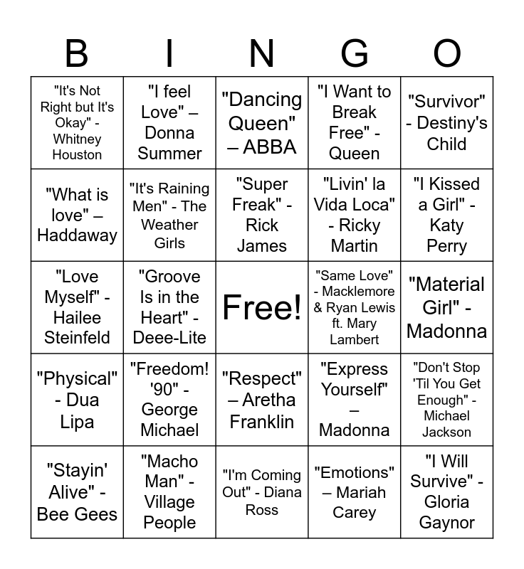 This bingo card has a free space and 50 words: "Born This Way" - Lady Gaga, "I Will Survive" - Gloria Gaynor, "Vogue" – Madonna, "I'm Coming Out" - Diana Ross, "Freedom! '90" - George Michael, "Supermodel (You Better Work)" – RuPaul, "I feel Love" – Donna Summer, "We are family" – Sister Sledge, "What is love" – Haddaway, "Born to Be Alive" - Patrick Hernandez, "It's Raining Men" - The Weather Girls, "I Want to Break Free" - Queen, "Don't Stop 'Til You Get Enough" - Michael Jackson, "Express Yourself" – Madonna, "Break free" – Ariana Grande, "YMCA" - Village People, "Super Freak" - Rick James, "Same Love" - Macklemore & Ryan Lewis ft. Mary Lambert, "Superstar" - Jamelia, "Survivor" - Destiny's Child, "Groove Is in the Heart" - Deee-Lite, "Emotions" – Mariah Carey, "It's Not Right but It's Okay" - Whitney Houston, "Livin' la Vida Loca" - Ricky Martin, "Believe" – Cher, "Wake Me Up Before You Go-Go" - Wham!, "I Kissed a Girl" - Katy Perry, "Your Disco Needs You" - Kylie Minogue, "Dancing Queen" – ABBA, "Respect" – Aretha Franklin, "I'm Too Sexy" - Right Said Fred, "I'm Every Woman" - Chaka Khan, "All the Lovers" - Kylie Minogue, "You Spin Me Round (Like a Record)" - Dead or Alive, "Macho Man" - Village People, "Love Shack" - The B-52's, "Toxic" – Britney Spears, "Sissy That Walk" - RuPaul, "You Need to Calm Down" - Taylor Swift, "Material Girl" - Madonna, "Under Pressure" - David Bowie, "Cover Girl" – RuPaul, "Don't Stop Me Now" - Queen, "Like a Prayer" - Madonna, "Stayin' Alive" - Bee Gees, "Love Myself" - Hailee Steinfeld, "Old Town Road" - Lil Nas X, "Dancing on My Own" - Robyn, "Physical" - Dua Lipa and "Montero (Call Me By Your Name)" - Lil Nas X.