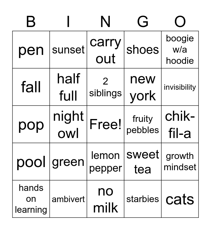 This bingo card has a free space and 24 words: green, ambivert, 2 siblings, hands on learning, boogie w/a hoodie, pen, fall, sunset, fruity pebbles, lemon pepper, new york, pop, sweet tea, growth mindset, half full, starbies, chik-fil-a, carry out, invisibility, night owl, cats, pool, shoes and no milk.