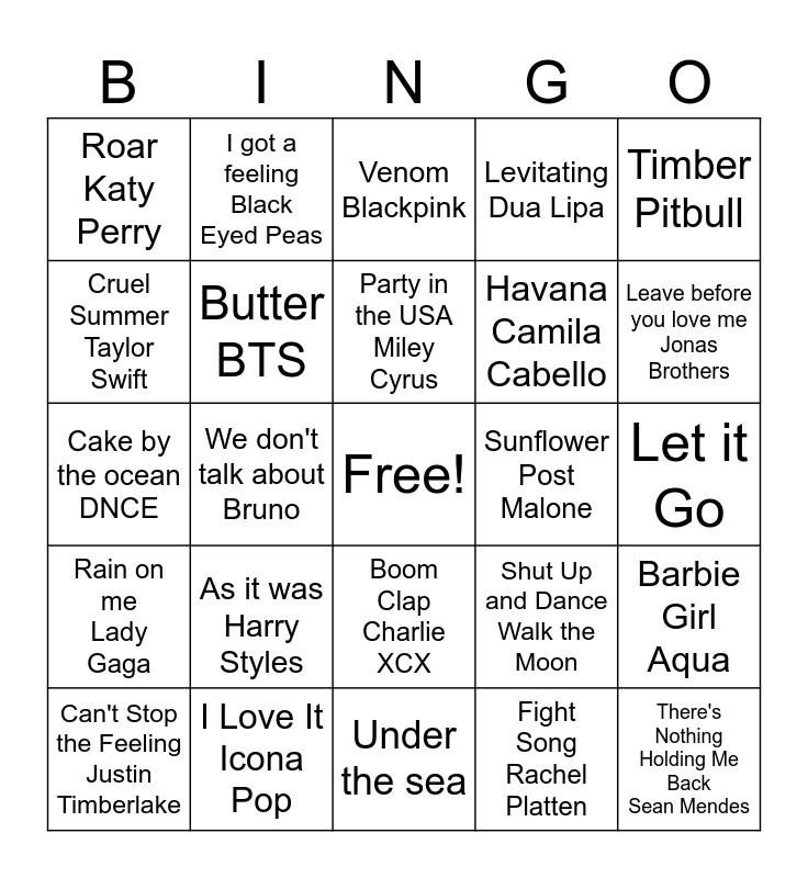 This bingo card has a free space and 24 words: As it was Harry Styles, I Love It Icona Pop, Party in the USA Miley Cyrus, Can't Stop the Feeling Justin Timberlake, Timber Pitbull, Roar Katy Perry, Cruel Summer Taylor Swift, I got a feeling Black Eyed Peas, Sunflower Post Malone, Boom Clap Charlie XCX, Havana Camila Cabello, Cake by the ocean DNCE, Shut Up and Dance Walk the Moon, Barbie Girl Aqua, Butter BTS, Fight Song Rachel Platten, Let it Go, Venom Blackpink, Leave before you love me Jonas Brothers, We don't talk about Bruno, There's Nothing Holding Me Back Sean Mendes, Rain on me Lady Gaga, Levitating Dua Lipa and Under the sea.