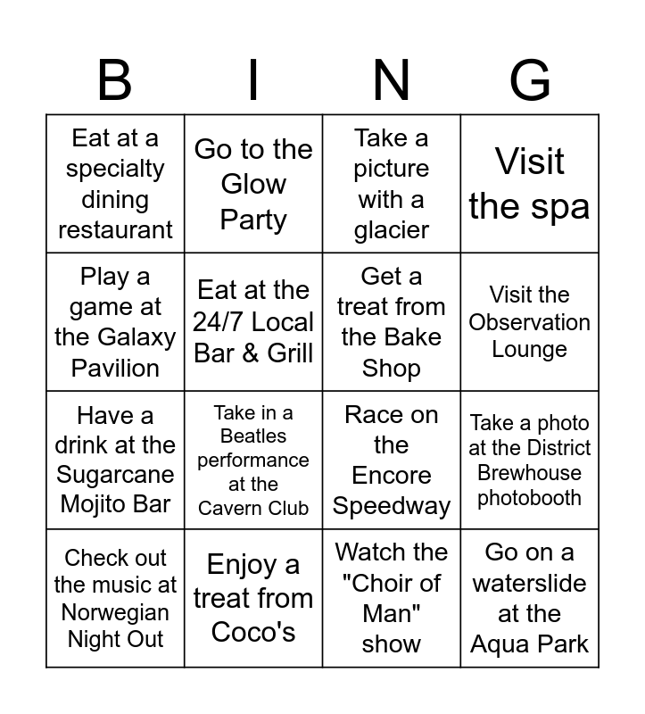 This bingo card has 16 words: Check out the music at Norwegian Night Out, Enjoy a treat from Coco's, Take a picture with a glacier, Visit the spa, Play a game at the Galaxy Pavilion, Go to the Glow Party, Race on the Encore Speedway, Take a photo at the District Brewhouse photobooth, Eat at a specialty dining restaurant, Eat at the 24/7 Local Bar & Grill, Watch the "Choir of Man" show, Visit the Observation Lounge, Have a drink at the Sugarcane Mojito Bar, Take in a Beatles performance at the Cavern Club, Get a treat from the Bake Shop and Go on a waterslide at the Aqua Park.