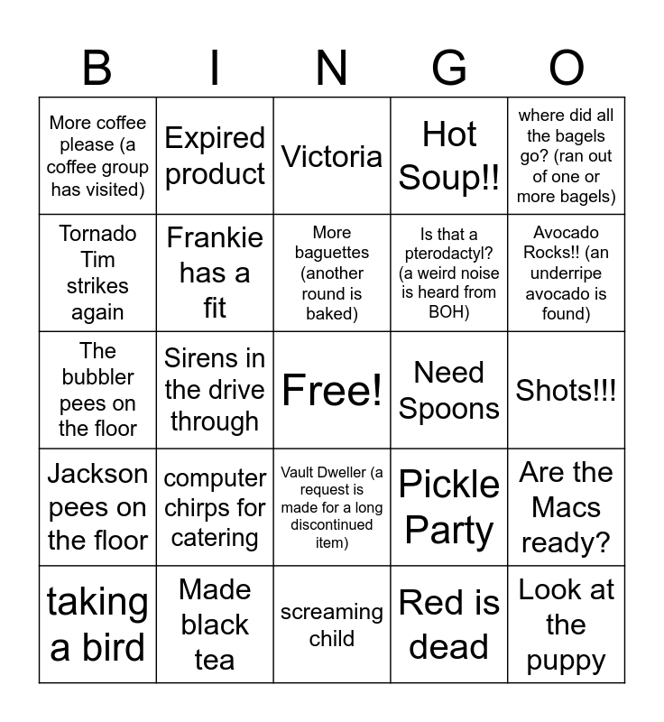 This bingo card has a free space and 25 words: computer chirps for catering, screaming child, More baguettes (another round is baked), taking a bird, where did all the bagels go? (ran out of one or more bagels), More coffee please (a coffee group has visited), Tornado Tim strikes again, Expired product, Need Spoons, Vault Dweller (a request is made for a long discontinued item), Is that a pterodactyl? (a weird noise is heard from BOH), The bubbler pees on the floor, Pickle Party, Are the Macs ready?, Frankie has a fit, What's my number? (a manager is paghed for an issue), Shots!!!, Victoria, Avocado Rocks!! (an underripe avocado is found), Sirens in the drive through, Look at the puppy, Made black tea, Jackson pees on the floor, Hot Soup!! and Red is dead.