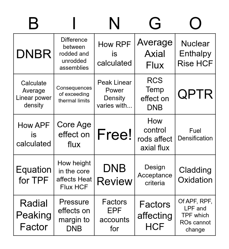 This bingo card has a free space and 24 words: How height in the core affects Heat Flux HCF, Pressure effects on margin to DNB, Peak Linear Power Density varies with..., Radial Peaking Factor, Nuclear Enthalpy Rise HCF, DNBR, Calculate Average Linear power density, Difference between rodded and unrodded assemblies, How control rods affect axial flux, DNB Review, RCS Temp effect on DNB, How APF is calculated, Design Acceptance criteria, Cladding Oxidation, Consequences of exceeding thermal limits, Factors affecting HCF, Fuel Densification, How RPF is calculated, QPTR, Core Age effect on flux, Of APF, RPF, LPF and TPF which ROs cannot change, Equation for TPF, Average Axial Flux and Factors EPF accounts for.
