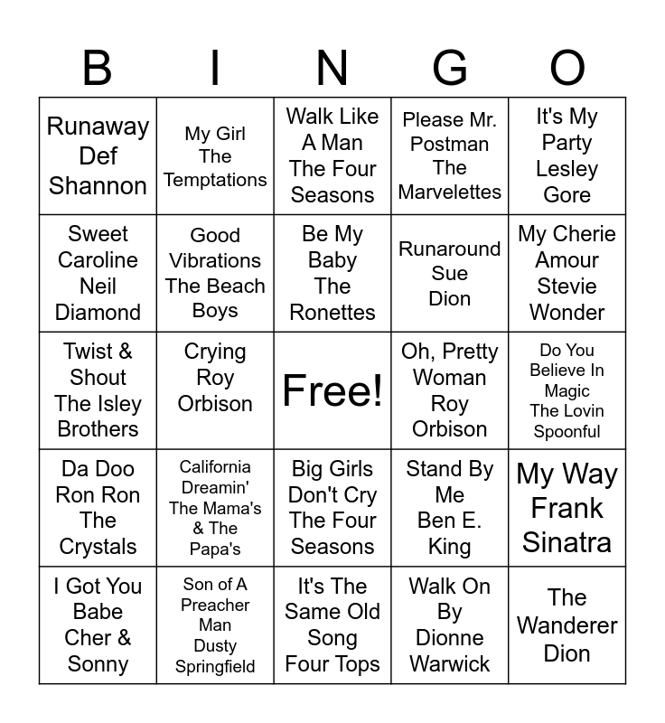 This bingo card has a free space and 24 words: California Dreamin' The Mama's & The Papa's, Son of A Preacher Man Dusty Springfield, Be My Baby The Ronettes, I Got You Babe Cher & Sonny, It's My Party Lesley Gore, Runaway Def Shannon, Sweet Caroline Neil Diamond, My Girl The Temptations, Oh, Pretty Woman Roy Orbison, Big Girls Don't Cry The Four Seasons, Runaround Sue Dion, Twist & Shout The Isley Brothers, Stand By Me Ben E. King, My Way Frank Sinatra, Good Vibrations The Beach Boys, Walk On By Dionne Warwick, Do You Believe In Magic The Lovin Spoonful, Walk Like A Man The Four Seasons, My Cherie Amour Stevie Wonder, Crying Roy Orbison, The Wanderer Dion, Da Doo Ron Ron The Crystals, Please Mr. Postman The Marvelettes and It's The Same Old Song Four Tops.