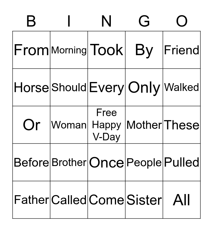 This bingo card has a free space and 24 words: Brother, Called, Every, Father, Friend, From, Horse, Morning, Mother, Once, Only, Or, People, Pulled, Should, Sister, These, Took, Walked, Woman, All, Before, By and Come.