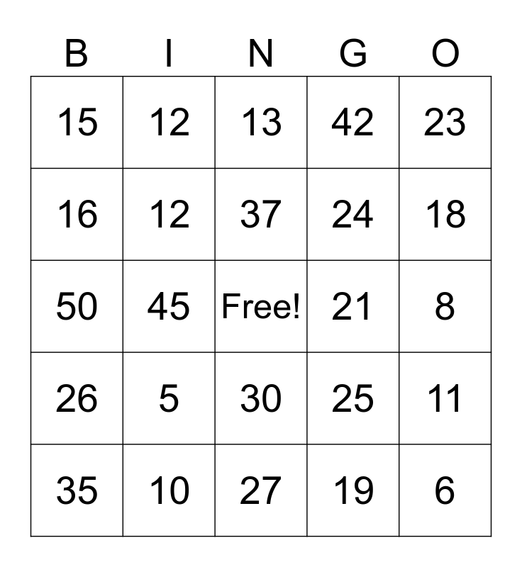 This bingo card has a free space and 24 words: 5, 10, 37, 35, 23, 15, 16, 12, 21, 30, 24, 50, 25, 11, 12, 19, 8, 13, 18, 45, 6, 26, 42 and 27.