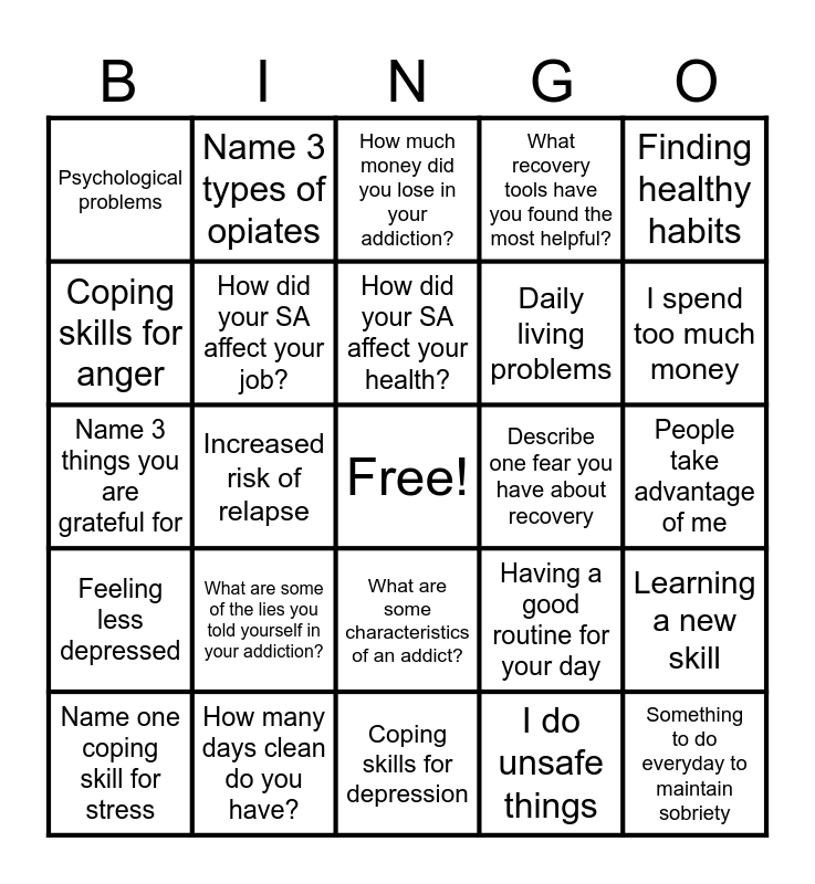 This bingo card has a free space and 45 words: Social problems, Something to do everyday to maintain sobriety, Describe your life after 1 year of sobriety, Name one coping skill for stress, How did your SA affect your health?, I do unsafe things, How much money did you lose in your addiction?, I get more irritated at others, Finding healthy habits, How many days clean do you have?, What recovery tools have you found the most helpful?, Describe one fear you have about recovery, What are some characteristics of an addict?, What are some of the lies you told yourself in your addiction?, Name 3 things you have control over, Coping skills for depression, Distracting myself from problems, Name 3 things you are grateful for, What are 2 slang terms for cocaine?, I spend too much money, Name 3 types of opiates, Name 2 of your triggers, Name 2 emotions that are triggers for you, Psychological problems, Financial problems, People take advantage of me, Feeling sociable, What parts of the body are affected by alcohol use?, Having a good routine for your day, Feeling less depressed, Feeling good, Learning a new skill, Coping skills for anxiety, What is your definition of recovery?, What is your definition of addiction?, Increased risk of relapse, What is something you can do for relaxation?, Name one of the 12 steps, Name 3 barriers to success in recovery, How did your SA affect your health?, Coping skills for anger, Daily living problems, What is your aftercare plan?, How did your SA affect your job? and Name something you lost in your addiction.