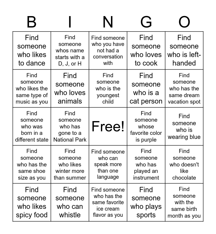 This bingo card has a free space and 25 words: Find someone who likes winter more than summer, Find someone who has the same favorite ice cream flavor as you, Find someone who is the youngest child, Find someone who likes spicy food, Find someone who is left-handed, Find someone who likes to dance, Find someone who likes the same type of music as you, Find someone whos name starts with a D, J, or H, Find someone whose favorite color is purple, Find someone who can speak more than one language, Find someone who is a cat person, Find someone who was born in a different state, Find someone who has played an instrument, Find someone who doesn't like chocolate, Find someone who loves animals, Find someone who likes to draw, Find someone who is wearing blue, Find someone who you have not had a conversation with, Find someone who has the same dream vacation spot, Find someone who has gone to a National Park, Find someone with the same birth month as you, Find someone who can whistle, Find someone who has the same shoe size as you, Find someone who loves to cook and Find someone who plays sports.