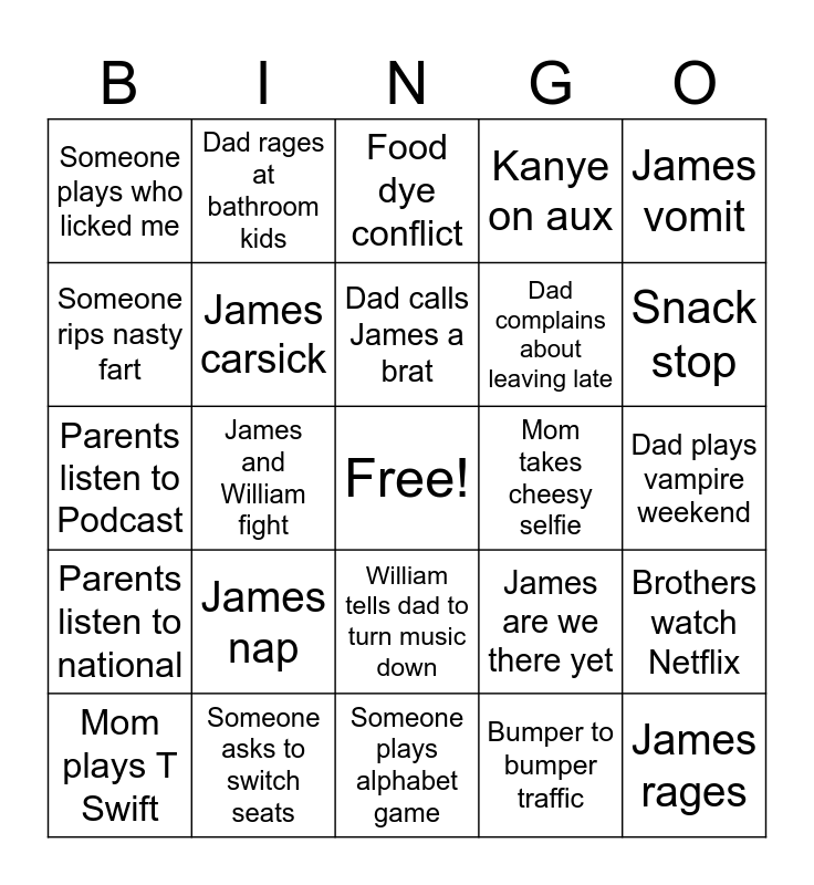 This bingo card has a free space and 24 words: James nap, Someone asks to switch seats, Dad calls James a brat, Mom plays T Swift, James vomit, Someone plays who licked me, Someone rips nasty fart, Dad rages at bathroom kids, Mom takes cheesy selfie, William tells dad to turn music down, Dad complains about leaving late, Parents listen to Podcast, James are we there yet, Brothers watch Netflix, James carsick, Bumper to bumper traffic, Dad plays vampire weekend, Food dye conflict, Snack stop, James and William fight, James rages, Parents listen to national, Kanye on aux and Someone plays alphabet game.