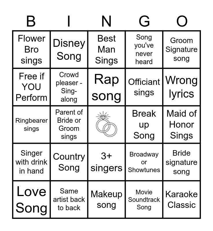 This bingo card has a free space and 24 words: Country Song, Same artist back to back, Rap song, Love Song, Groom Signature song, Flower Bro sings, Free if YOU Perform, Disney Song, Break up Song, 3+ singers, Officiant sings, Ringbearer sings, Broadway or Showtunes, Bride signature song, Crowd pleaser - Sing-along, Movie Soundtrack Song, Maid of Honor Sings, Best Man Sings, Wrong lyrics, Parent of Bride or Groom sings, Karaoke Classic, Singer with drink in hand, Song you've never heard and Makeup song.