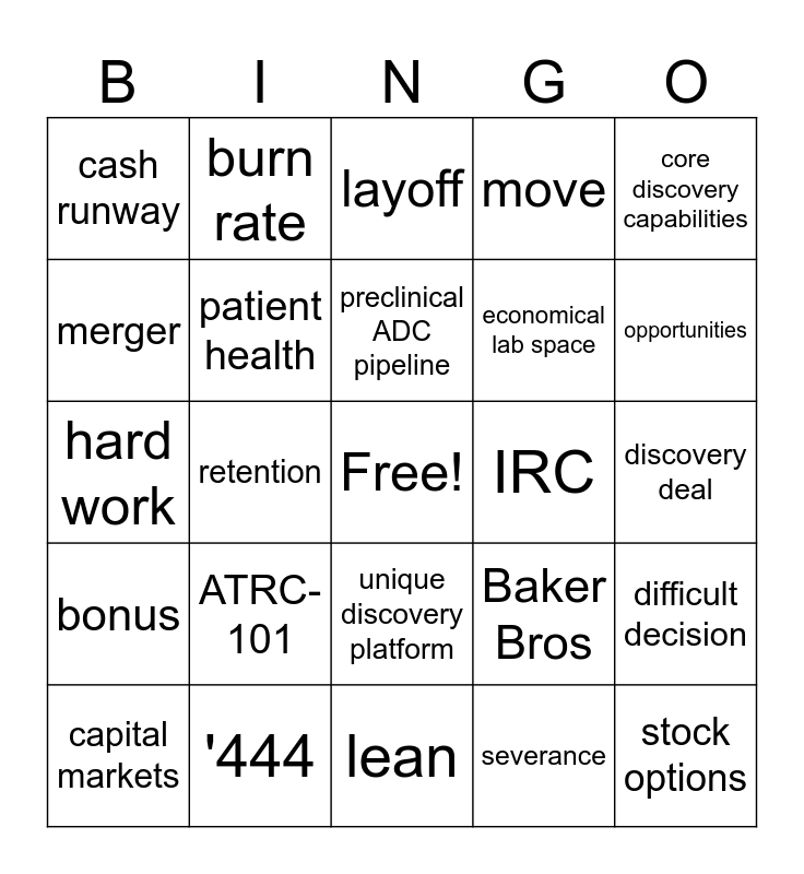 This bingo card has a free space and 24 words: ATRC-101, '444, preclinical ADC pipeline, capital markets, core discovery capabilities, cash runway, merger, burn rate, IRC, unique discovery platform, economical lab space, hard work, Baker Bros, difficult decision, patient health, severance, discovery deal, layoff, opportunities, retention, stock options, bonus, move and lean.