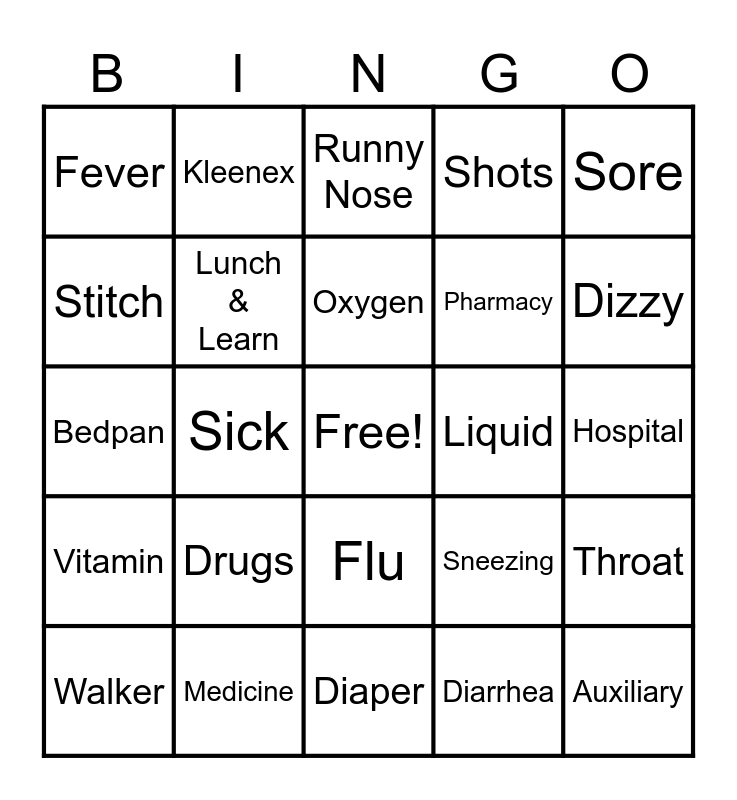This bingo card has a free space and 69 words: Pharmacist, Hospital, Stomachache, Coughing, Medicine, Tablet, Shots, Cold, Sore, Cure, Throat, Doctor, Fever, Runny Nose, Hurt, Sick, Flu, Pharmacy, Headache, Vitamin, Liquid, Sneezing, Dizzy, Symptom, Sick, Liquid, Fracture, Cut, Diarrhea, Bandaid, Kleenex, Lobby, ER, Lab, Shuttle, Imaging, Wheelchair, Needle, Stitch, Ambulance, Drugs, Auxiliary, Nurse, ICU, Surgery, Walker, Therapy, Diet, Fluids, Lunch & Learn, Oxygen, IV not the #, Crutches, Diaper, Shunt, Port, Defibulator, Mask, Urinal, Bedpan, Tray, Sink, Shower, Scrubs, Wound, Scar, Gauze, Tape and Chart.