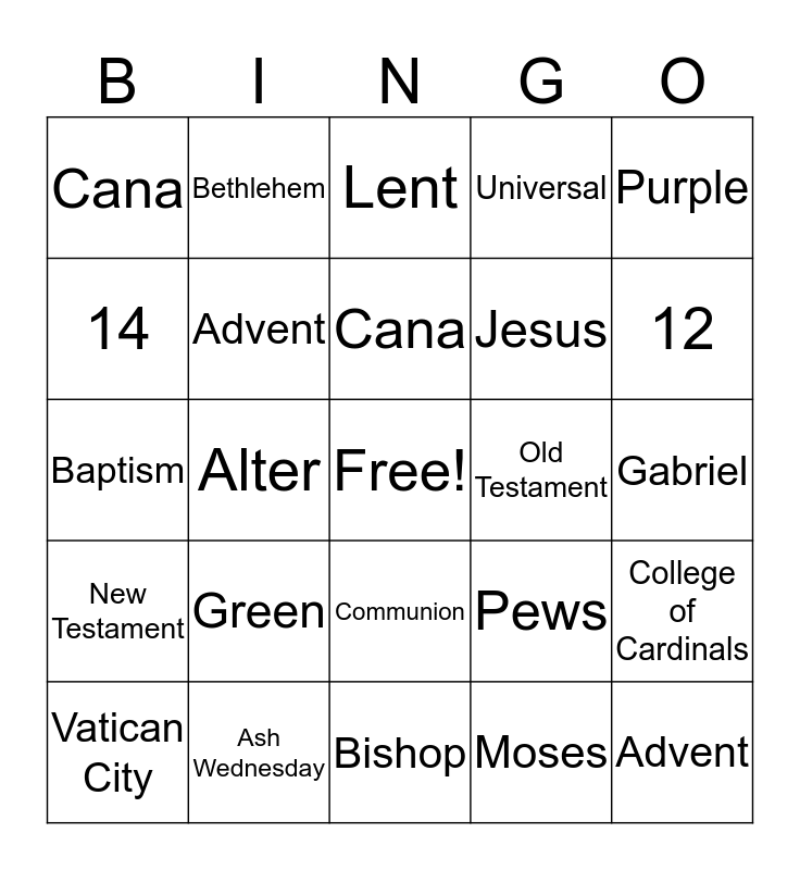 This bingo card has a free space and 24 words: Green, Ash Wednesday, Cana, Vatican City, Purple, Cana, 14, Bethlehem, Old Testament, Communion, Jesus, Baptism, Pews, College of Cardinals, Advent, Moses, Gabriel, Lent, 12, Alter, Advent, New Testament, Universal and Bishop.