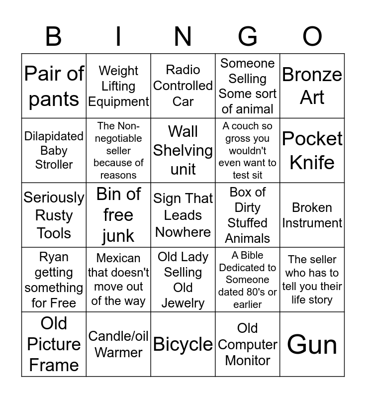This bingo card has a free space and 24 words: Mexican that doesn't move out of the way, Candle/oil Warmer, Wall Shelving unit, Old Picture Frame, Bronze Art, Pair of pants, Dilapidated Baby Stroller, Weight Lifting Equipment, Box of Dirty Stuffed Animals, Old Lady Selling Old Jewelry, A couch so gross you wouldn't even want to test sit, Seriously Rusty Tools, A Bible Dedicated to Someone dated 80's or earlier, The seller who has to tell you their life story, The Non-negotiable seller because of reasons, Old Computer Monitor, Broken Instrument, Radio Controlled Car, Pocket Knife, Bin of free junk, Gun, Ryan getting something for Free, Someone Selling Some sort of animal and Bicycle.