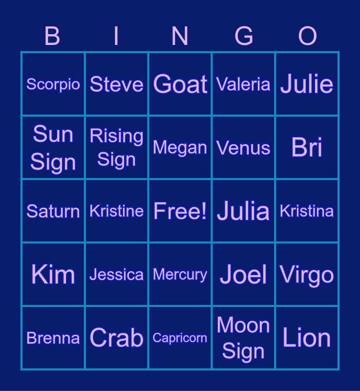 This bingo card has a free space and 24 words: Jessica, Crab, Megan, Brenna, Julie, Scorpio, Sun Sign, Steve, Julia, Mercury, Venus, Saturn, Joel, Virgo, Rising Sign, Moon Sign, Kristina, Goat, Bri, Kristine, Lion, Kim, Valeria and Capricorn.