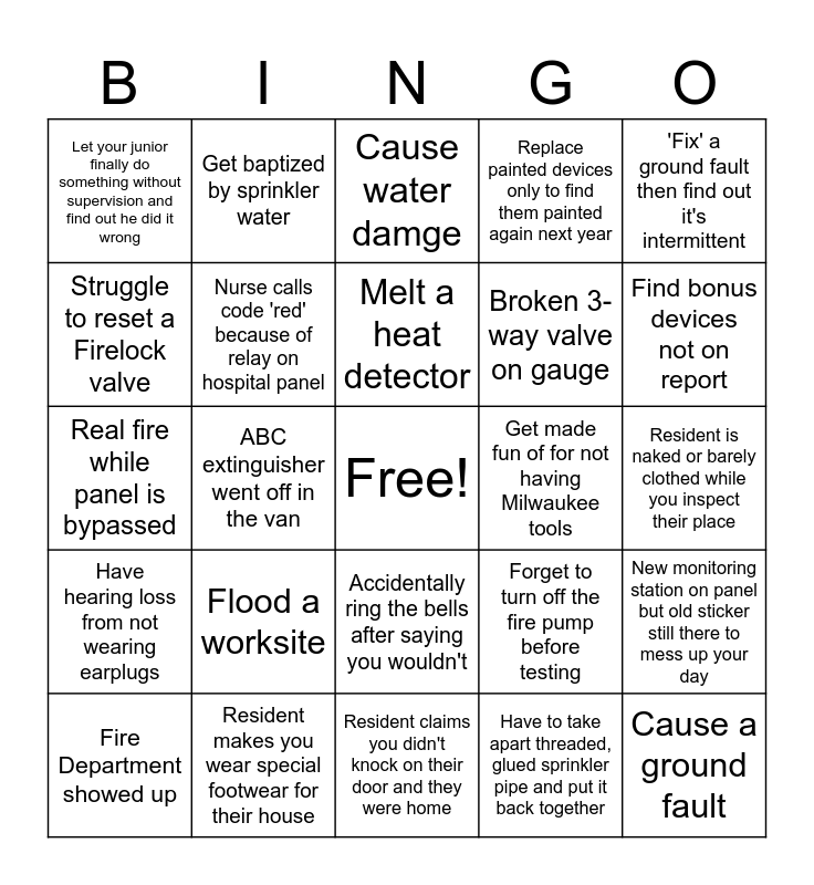 This bingo card has a free space and 24 words: Flood a worksite, Resident makes you wear special footwear for their house, Melt a heat detector, Fire Department showed up, 'Fix' a ground fault then find out it's intermittent, Let your junior finally do something without supervision and find out he did it wrong, Struggle to reset a Firelock valve, Get baptized by sprinkler water, Get made fun of for not having Milwaukee tools, Accidentally ring the bells after saying you wouldn't, Broken 3-way valve on gauge, Real fire while panel is bypassed, Forget to turn off the fire pump before testing, New monitoring station on panel but old sticker still there to mess up your day, Nurse calls code 'red' because of relay on hospital panel, Have to take apart threaded, glued sprinkler pipe and put it back together, Resident is naked or barely clothed while you inspect their place, Cause water damge, Find bonus devices not on report, ABC extinguisher went off in the van, Cause a ground fault, Have hearing loss from not wearing earplugs, Replace painted devices only to find them painted again next year and Resident claims you didn't knock on their door and they were home.