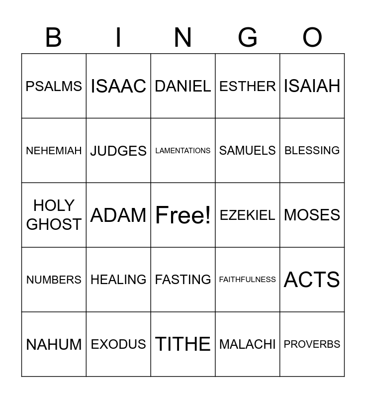 This bingo card has a free space and 62 words: GENESIS, EXODUS, LEVITICUS, NUMBERS, DEUTERONOMY, JOSHUA, JUDGES, RUTH, SAMUELS, CHRONICLES, ESTHER, KINGS, NEHEMIAH, EZRA, JOB, PSALMS, PROVERBS, ISAIAH, JEREMIAH, LAMENTATIONS, EZEKIEL, DANIEL, NAHUM, MALACHI, MATTHEW, MARK, LUKE, JOHN, ACTS, ROMANS, PAUL, CENTURION, ELIJAH, ELISHA, MOSES, ISAAC, ABRAHAM, CREATION, ADAM, BAPTISM, HOLY GHOST, CHURCH, HEALING, DELIVERANCE, BLESSING, FAITHFULNESS, HEAVEN, JESUS, ABIDE, PRAYER, FASTING, TITHE, WORSHIP, FORGIVE, MERCY, GRACE, KINDNESS, LOVE, COMPASSION, SERVE, HUMILTY and GRATITUDE.