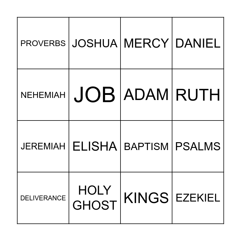 This bingo card has 63 words: Free!, GENESIS, EXODUS, LEVITICUS, NUMBERS, DEUTERONOMY, JOSHUA, JUDGES, RUTH, SAMUELS, CHRONICLES, ESTHER, KINGS, NEHEMIAH, EZRA, JOB, PSALMS, PROVERBS, ISAIAH, JEREMIAH, LAMENTATIONS, EZEKIEL, DANIEL, NAHUM, MALACHI, MATTHEW, MARK, LUKE, JOHN, ACTS, ROMANS, PAUL, CENTURION, ELIJAH, ELISHA, MOSES, ISAAC, ABRAHAM, CREATION, ADAM, BAPTISM, HOLY GHOST, CHURCH, HEALING, DELIVERANCE, BLESSING, FAITHFULNESS, HEAVEN, JESUS, ABIDE, PRAYER, FASTING, TITHE, WORSHIP, FORGIVE, MERCY, GRACE, KINDNESS, LOVE, COMPASSION, SERVE, HUMILTY and GRATITUDE.