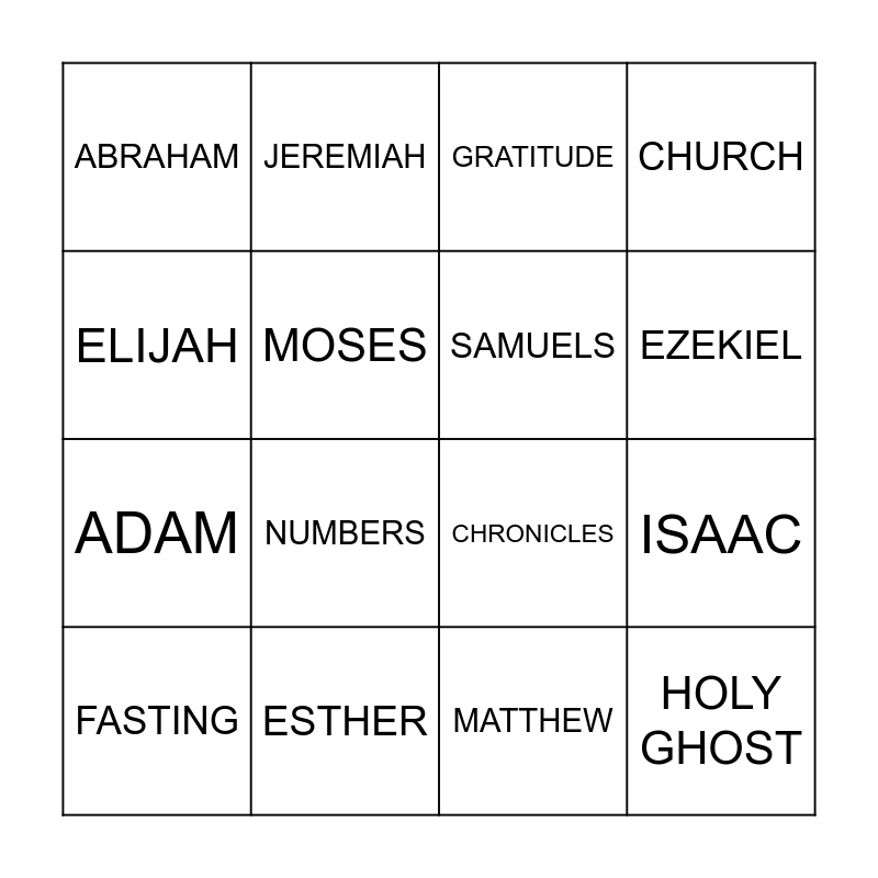 This bingo card has 63 words: Free!, EZRA, JOB, PSALMS, PROVERBS, ISAIAH, JEREMIAH, LAMENTATIONS, EZEKIEL, DANIEL, NAHUM, MALACHI, MATTHEW, ELIJAH, ELISHA, MOSES, ISAAC, ABRAHAM, CREATION, ADAM, BAPTISM, HOLY GHOST, CHURCH, HEALING, DELIVERANCE, BLESSING, FAITHFULNESS, HEAVEN, JESUS, ABIDE, PRAYER, GENESIS, EXODUS, LEVITICUS, NUMBERS, DEUTERONOMY, JOSHUA, JUDGES, RUTH, SAMUELS, CHRONICLES, ESTHER, KINGS, NEHEMIAH, FASTING, TITHE, WORSHIP, FORGIVE, MERCY, GRACE, KINDNESS, LOVE, COMPASSION, SERVE, HUMILTY, GRATITUDE, MARK, LUKE, JOHN, ACTS, ROMANS, PAUL and CENTURION.