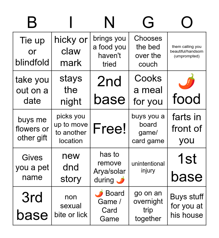 This bingo card has a free space and 24 words: new dnd story, non sexual bite or lick, 2nd base, 3rd base, them calling you beautiful/handsom (umprompted), Tie up or blindfold, take you out on a date, hicky or claw mark, buys you a board game/ card game, has to remove Arya/solar during 🌶, Cooks a meal for you, buys me flowers or other gift, unintentional injury, 1st base, stays the night, go on an overnight trip together, farts in front of you, brings you a food you haven't tried, 🌶 food, picks you up to move to another location, Buys stuff for you at his house, Gives you a pet name, Chooses the bed over the couch and 🌶 Board Game / Card Game.