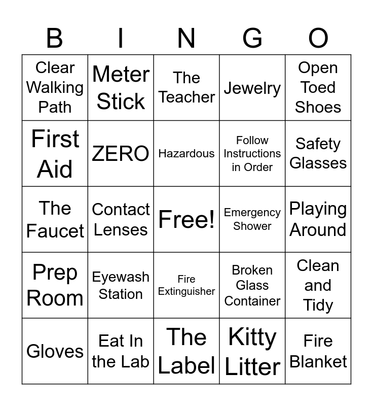 This bingo card has a free space and 45 words: Goggles, Fire Blanket, Lab Apron, Gloves, Fume Hood, Kitty Litter, The Teacher, Tied Back Behind Your Head, Open Toed Shoes, Eat In the Lab, Jewelry, Emergency Shower, Fire Extinguisher, Eyewash Station, Magnetic Wool, The Label, Turn the Gas Off, The Faucet, Emergency Shut Off, Safety Glasses, Meter Stick, Stop Watch, Calculator, Clear Walking Path, Headphones, Playing Around, Safety Contract, During Tutorial Times, Broken Glass Container, Prep Room, Fire Drill, Clean and Tidy, Chemical Spill, Unauthorized Experiments, Wash Your Hands, Contact Lenses, Measurements, Disinfect, Electrical Socket, Hazardous, First Aid, Follow Instructions in Order, Rinse In the Sink, ZERO and Safety Test.
