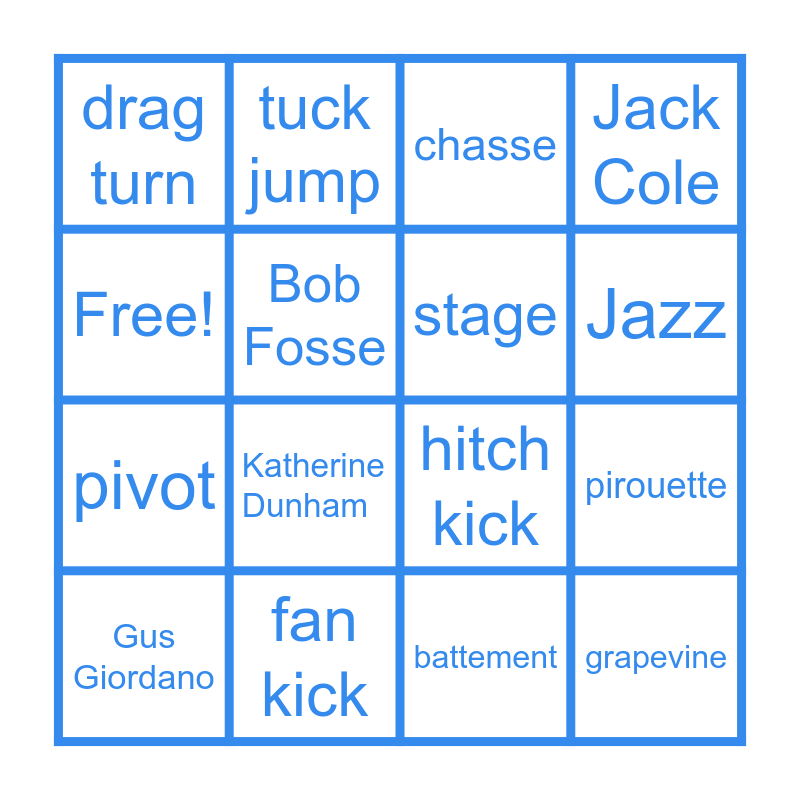 This bingo card has 16 words: fan kick, pirouette, chasse, drag turn, pivot, tuck jump, hitch kick, battement, Free!, Bob Fosse, Gus Giordano, Jack Cole, Katherine Dunham, Jazz, stage and grapevine.