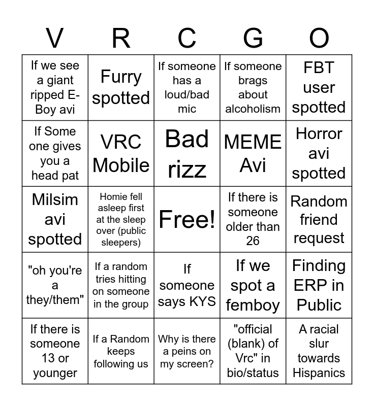 This bingo card has a free space and 44 words: A racial slur towards Black, A racial slur towards Hispanics, A slur towards LGBTQ+, If there is someone 13 or younger, If someone uses a sound board, "official (blank) of Vrc" in bio/status, If someone has a loud/bad mic, If someone is RP specific character, FBT user spotted, If a Random keeps following us, If someone brags about alcoholism, If there is someone older than 26, If someone says KYS, If a random tries hitting on someone in the group, If we spot a random RP group, Why is there a peins on my screen?, If a random calls us poor, Milsim avi spotted, SCP avi spotted, Horror avi spotted, Furry spotted, Mute spotted, If we get timed out or crashed, If we see a giant ripped E-Boy avi, If we spot a big booba E-girl avi, Random friend request, If someone we cant remember joins us, Random music player, If we spot a femboy, "oh you're a they/them", A pack of trusted/known users, Finding ERP in Public, Dad's home!!(someone who is drunk), One with nature (someone who is high), Homie fell asleep first at the sleep over (public sleepers), Just dance (someone just vibing, full body or partial), pole dancer, my mom/dad is dead, Bad rizz, If Some one gives you a head pat, MEME Avi, If someone is singing, VRC Mobile and ARE YOU A GUY.
