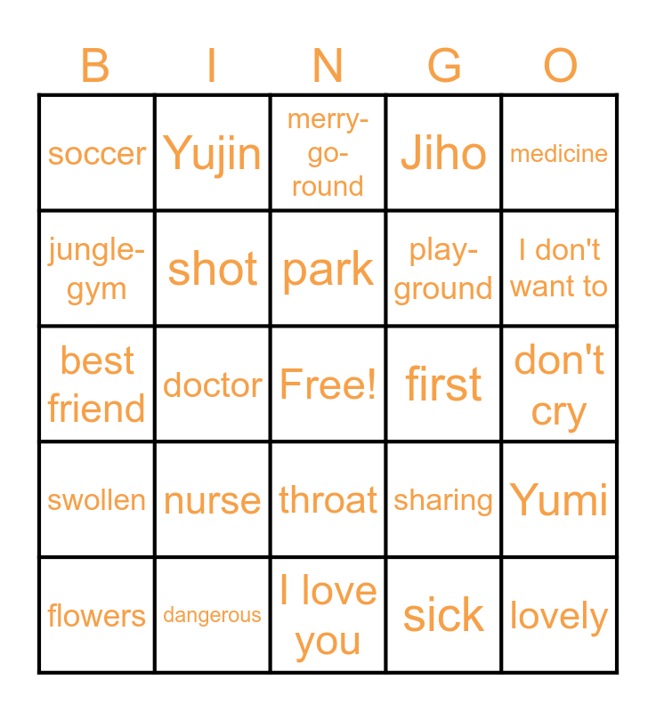 This bingo card has a free space and 29 words: flowers, sister, doctor, ball, soccer, merry-go-round, shot, nurse, first, dangerous, don't cry, lovely, I love you, sick, I don't want to, hurt, throat, swollen, medicine, best friend, sharing, kick, play-ground, jungle-gym, Jiho, Yujin, Yumi, park and brave.