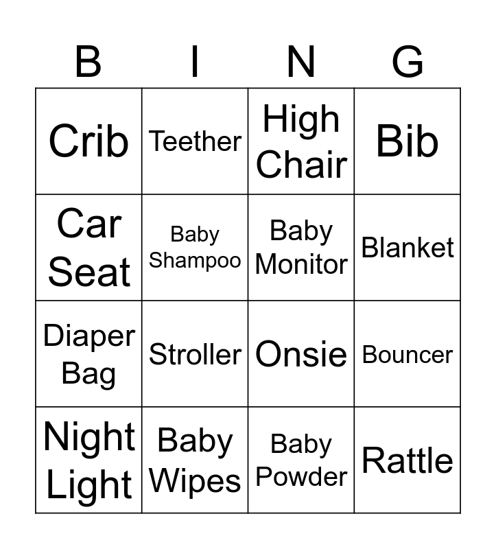 This bingo card has 16 words: Baby Wipes, Bouncer, High Chair, Crib, Diaper Bag, Teether, Onsie, Baby Powder, Car Seat, Baby Shampoo, Night Light, Bib, Stroller, Blanket, Baby Monitor and Rattle.