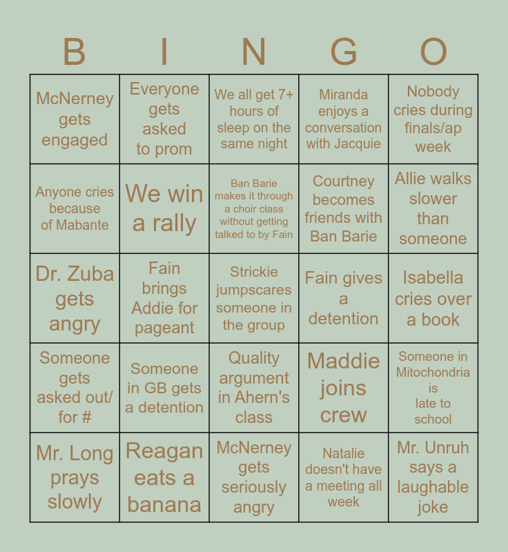 This bingo card has a free space and 24 words: Someone in GB gets a detention, Reagan eats a banana, Ban Barie makes it through a choir class without getting talked to by Fain, Mr. Long prays slowly, Nobody cries during finals/ap week, McNerney gets engaged, Anyone cries because of Mabante, Everyone gets asked to prom, Fain gives a detention, Quality argument in Ahern's class, Courtney becomes friends with Ban Barie, Dr. Zuba gets angry, Maddie joins crew, Someone in Mitochondria is late to school, We win a rally, Natalie doesn't have a meeting all week, Isabella cries over a book, We all get 7+ hours of sleep on the same night, Allie walks slower than someone, Fain brings Addie for pageant, Mr. Unruh says a laughable joke, Someone gets asked out/ for #, Miranda enjoys a conversation with Jacquie and McNerney gets seriously angry.