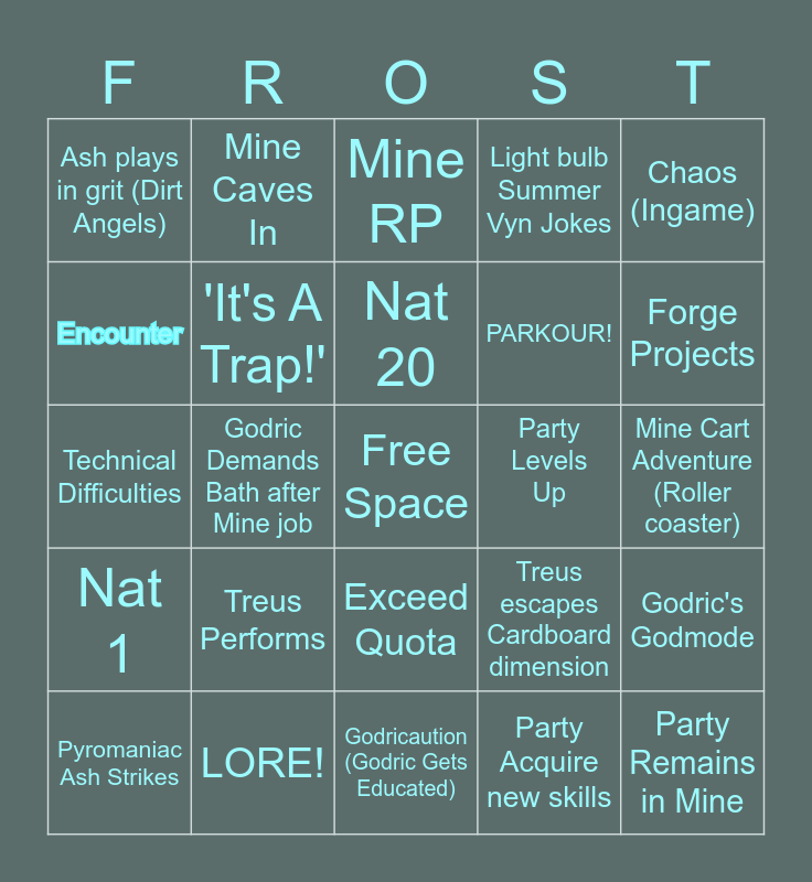 This bingo card has a free space and 25 words: Pyromaniac Ash Strikes, Treus Performs, Nat 20, Party Acquire new skills, Forge Projects, Ash plays in grit (Dirt Angels), Mine Caves In, Mine RP, PARKOUR!, Godric's Godmode, Technical Difficulties, 'It's A Trap!', Treus escapes Cardboard dimension, Party Remains in Mine, Encounter, LORE!, Godricaution (Godric Gets Educated), Light bulb Summer Vyn Jokes, Mine Cart Adventure (Roller coaster), Nat 1, Godric Demands Bath after Mine job, Exceed Quota, Party Levels Up, Chaos (Ingame) and Free Space.
