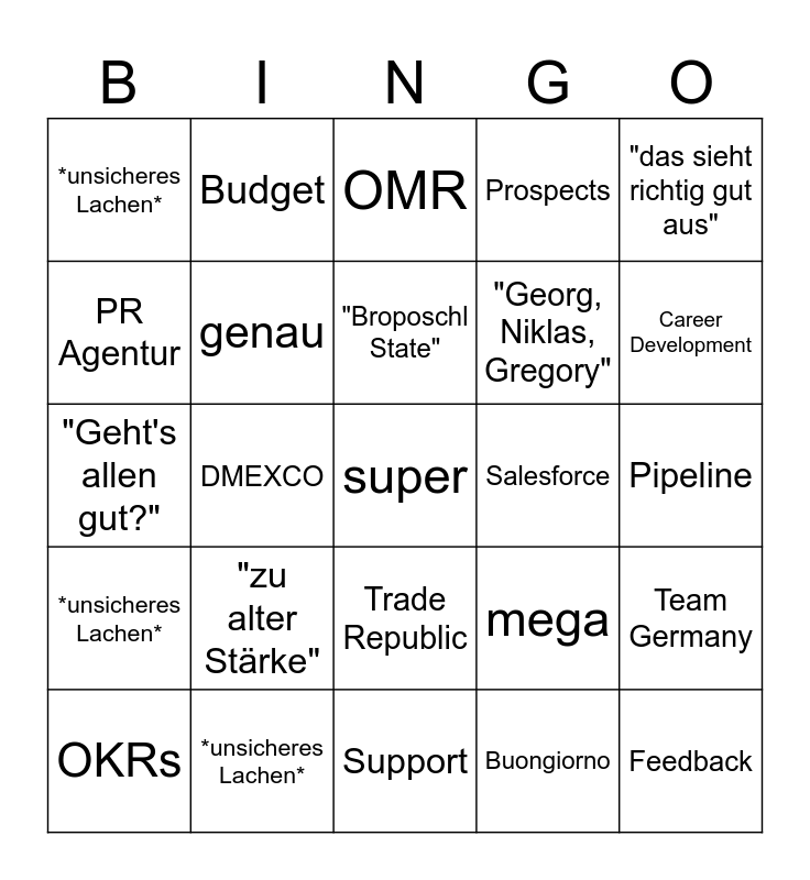 This bingo card has a free space and 24 words: "zu alter Stärke", *unsicheres Lachen*, "Broposchl State", OKRs, "das sieht richtig gut aus", *unsicheres Lachen*, PR Agentur, Budget, Salesforce, Trade Republic, "Georg, Niklas, Gregory", "Geht's allen gut?", mega, Team Germany, genau, Buongiorno, Pipeline, OMR, Career Development, DMEXCO, Feedback, *unsicheres Lachen*, Prospects and Support.