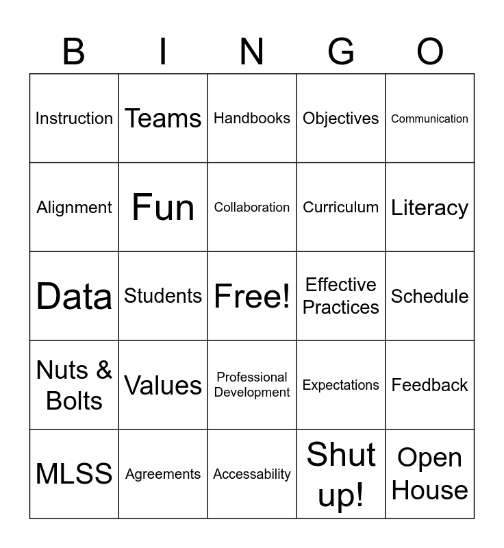 This bingo card has a free space and 24 words: Values, Agreements, Collaboration, MLSS, Communication, Instruction, Alignment, Teams, Effective Practices, Professional Development, Curriculum, Data, Expectations, Feedback, Fun, Shut up!, Schedule, Handbooks, Literacy, Students, Open House, Nuts & Bolts, Objectives and Accessability.
