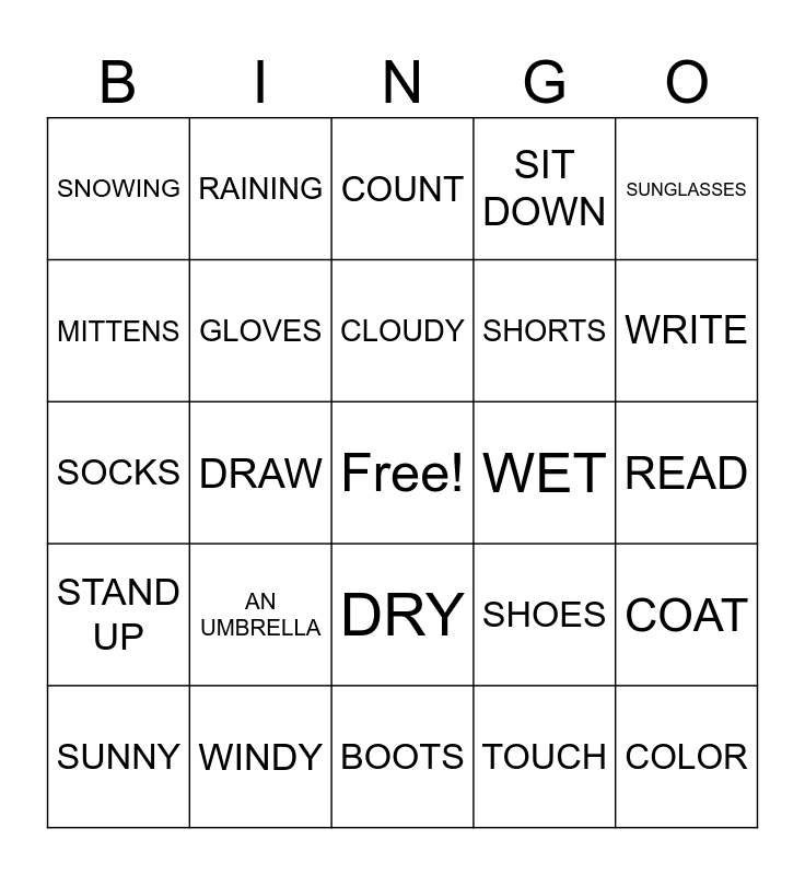 This bingo card has a free space and 24 words: AN UMBRELLA, WINDY, CLOUDY, SUNNY, SUNGLASSES, SNOWING, MITTENS, RAINING, WET, DRY, SHORTS, SOCKS, SHOES, COAT, GLOVES, TOUCH, READ, COUNT, WRITE, DRAW, COLOR, STAND UP, SIT DOWN and BOOTS.