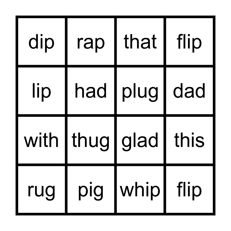 This bingo card has 28 words: chap, ship, whip, ship, lip, rap, that, this, with, pig, shot, flip, dip, rip, ship, pop, mop, had, glad, flip, dip, dog, mum, dad, rug, thug, plug and shrug.