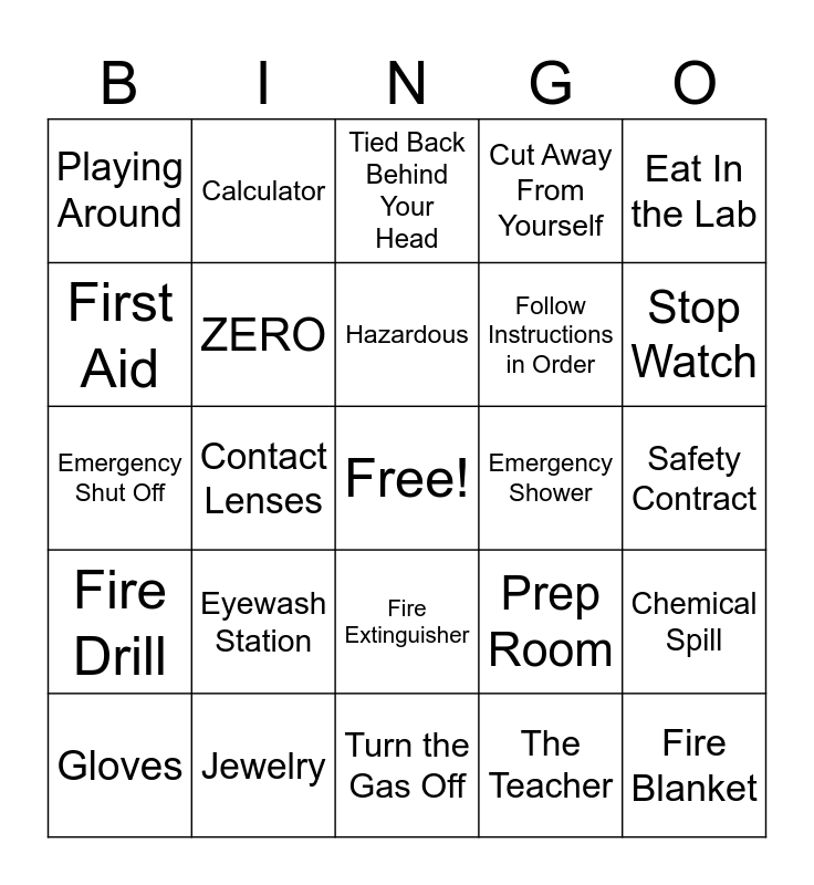 This bingo card has a free space and 44 words: Goggles, Fire Blanket, Lab Apron, Gloves, Fume Hood, The Teacher, Tied Back Behind Your Head, Open Toed or Heeled Shoes, Eat In the Lab, Jewelry, Cut Away From Yourself, Emergency Shower, Fire Extinguisher, Eyewash Station, The Label, Turn the Gas Off, The Faucet, Emergency Shut Off, Meter Stick, Stop Watch, Calculator, Clear Walking Path, Headphones, Playing Around, Bloodborne Pathogens, Safety Contract, During Tutorial Times, Broken Glass Container, Prep Room, Fire Drill, Clean and Tidy, Chemical Spill, Write Up, Wash Your Hands, Contact Lenses, Measurements, Disinfect, Electrical Socket, Hazardous, First Aid, Follow Instructions in Order, Rinse In the Sink, ZERO and Safety Test.
