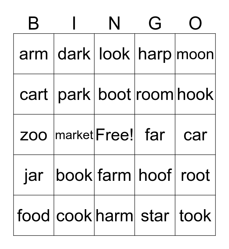 This bingo card has a free space and 24 words: book, cook, boot, food, moon, arm, cart, dark, far, farm, room, zoo, hoof, root, park, star, car, look, hook, market, took, jar, harp and harm.