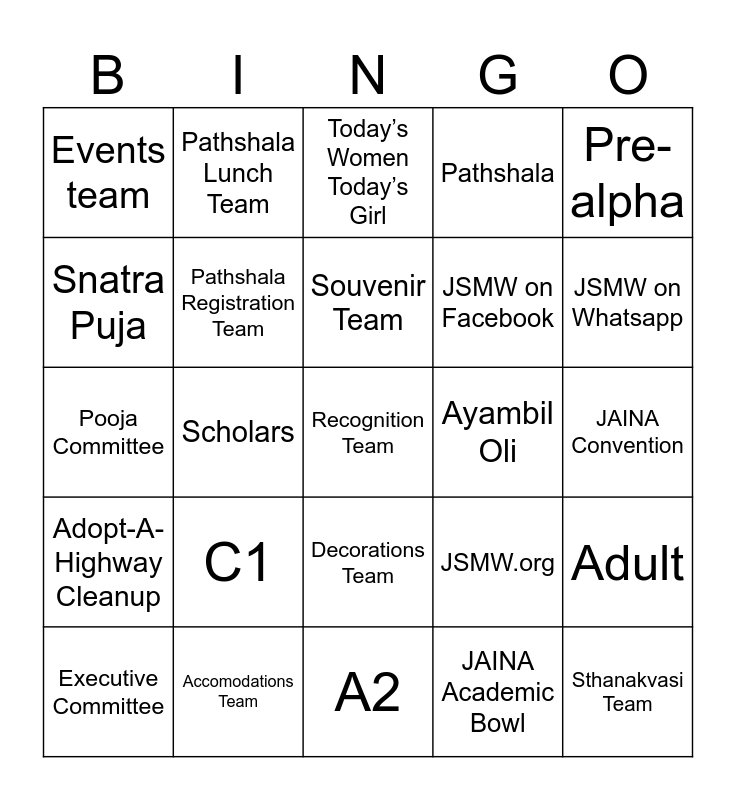 This bingo card has 75 words: Free!, Volunteer Team, Today’s Women Today’s Girl, Temple Committee, Technology Team, Teachers, Swetamber Team, Swapna Ceremony, Sutra, Student Aides, Sthanakvasi Team, Special Pujans, Souvenir Team, Snatra Puja, Security Team, Scholars, Sadharmik Vatsalya Team, Recognition Team, Publication Team, Pre-alpha, Pratistha Mahotsav, Pooja Committee, Pathshala Registration Team, Pathshala Lunch Team, Pathshala, Paryusan MahaParva, Parking&Transportation Team, Nursery, Medical First Aid Team, Mahavir Janma Kalyanak, Legal Team, Koba, JYOC, JSMW.org, JSMW on Whatsapp, JSMW on Facebook, Jinvaani, Jains Got Talent, JAINA Convention, JAINA Academic Bowl, India Coordination Team, Hindi, Gujarati, Gheeboli Team, G, Finance Team, Executive Committee, Events team, E, Digamber Team, Dev Shastra Guru Pooja, Decorations Team, Day Time Activity Team, Daslaxan MahaParva, D2, D1, Cultural Program Team, County Permits Team, Construction Committee, C2, C1, Board of Trustees, Bhagwan Transportation Team, B2, B1, Ayambil Oli, AV&Photography Team, Ashtaprakari/Kesar Pooja, Advisory Team, Adult, Adopt-A-Highway Cleanup, Accomodations Team, Aangi/Gahuli/Rangoli Team, A2 and A1.