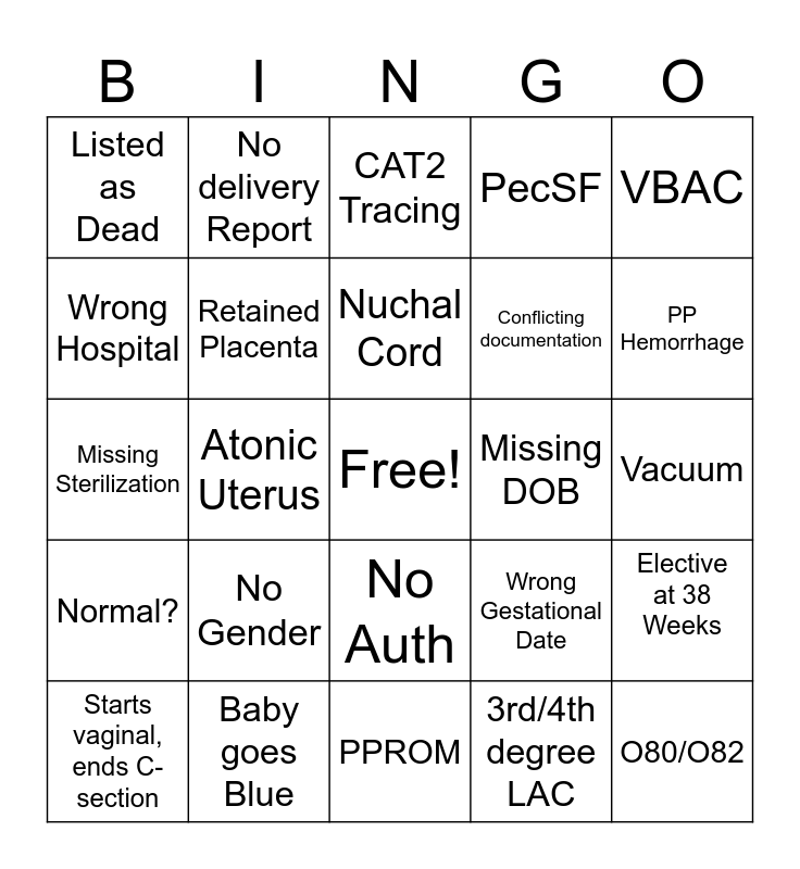 This bingo card has a free space and 24 words: No Gender, Baby goes Blue, Nuchal Cord, Starts vaginal, ends C-section, VBAC, Listed as Dead, Wrong Hospital, No delivery Report, Missing DOB, No Auth, Conflicting documentation, Missing Sterilization, Wrong Gestational Date, Elective at 38 Weeks, Retained Placenta, 3rd/4th degree LAC, Vacuum, CAT2 Tracing, PP Hemorrhage, Atonic Uterus, O80/O82, Normal?, PecSF and PPROM.