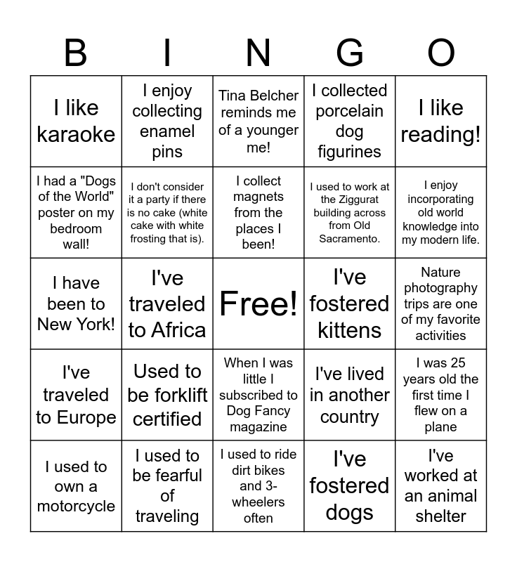 This bingo card has a free space and 35 words: I save cat whiskers when I find them around the house, I drink black coffee, I sleep on my stomach, I don't consider it a party if there is no cake (white cake with white frosting that is)., When I was little I subscribed to Dog Fancy magazine, I collected porcelain dog figurines, I had a "Dogs of the World" poster on my bedroom wall!, My pup lets me dress him up in any kind of get-up imaginable!, I collect magnets from the places I been!, I like hiking!, I have been to New York!, I like reading!, I know basic basic sign language (ASL)!, I know basic Spanish!, I like karaoke, I've fostered kittens, I've fostered dogs, I've traveled to Africa, I've traveled to Europe, I've worked at an animal shelter, I've lived in another country, I used to own a motorcycle, I was 25 years old the first time I flew on a plane, I used to be fearful of traveling, Tina Belcher reminds me of a younger me!, I enjoy incorporating old world knowledge into my modern life., I will never willingly adopt a puppy for myself., I used to drive a tiny train at a zoo., I used to work at the Ziggurat building across from Old Sacramento., Nature photography trips are one of my favorite activities, I've been skydiving, I used to ride dirt bikes and 3-wheelers often, Used to be forklift certified, I enjoy collecting enamel pins and Dressed up as the character Moss from the show IT Crowd for Halloween.