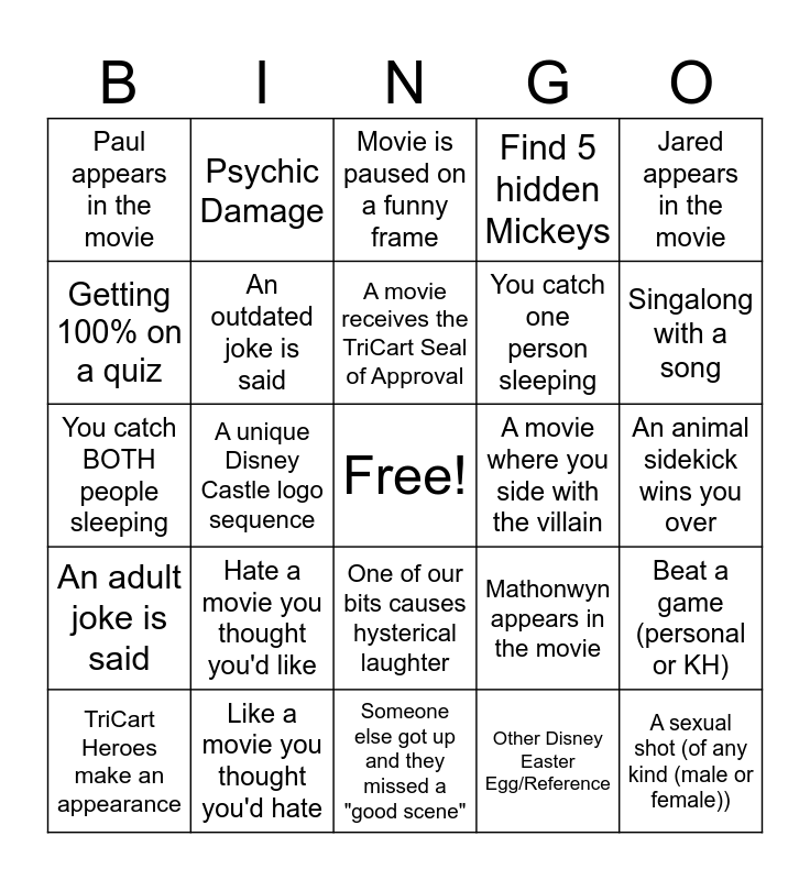 This bingo card has a free space and 24 words: Hate a movie you thought you'd like, Like a movie you thought you'd hate, A movie receives the TriCart Seal of Approval, TriCart Heroes make an appearance, Jared appears in the movie, Paul appears in the movie, Getting 100% on a quiz, Psychic Damage, A movie where you side with the villain, One of our bits causes hysterical laughter, You catch one person sleeping, You catch BOTH people sleeping, Mathonwyn appears in the movie, Beat a game (personal or KH), An outdated joke is said, Other Disney Easter Egg/Reference, An animal sidekick wins you over, Movie is paused on a funny frame, Singalong with a song, A unique Disney Castle logo sequence, A sexual shot (of any kind (male or female)), An adult joke is said, Find 5 hidden Mickeys and Someone else got up and they missed a "good scene".