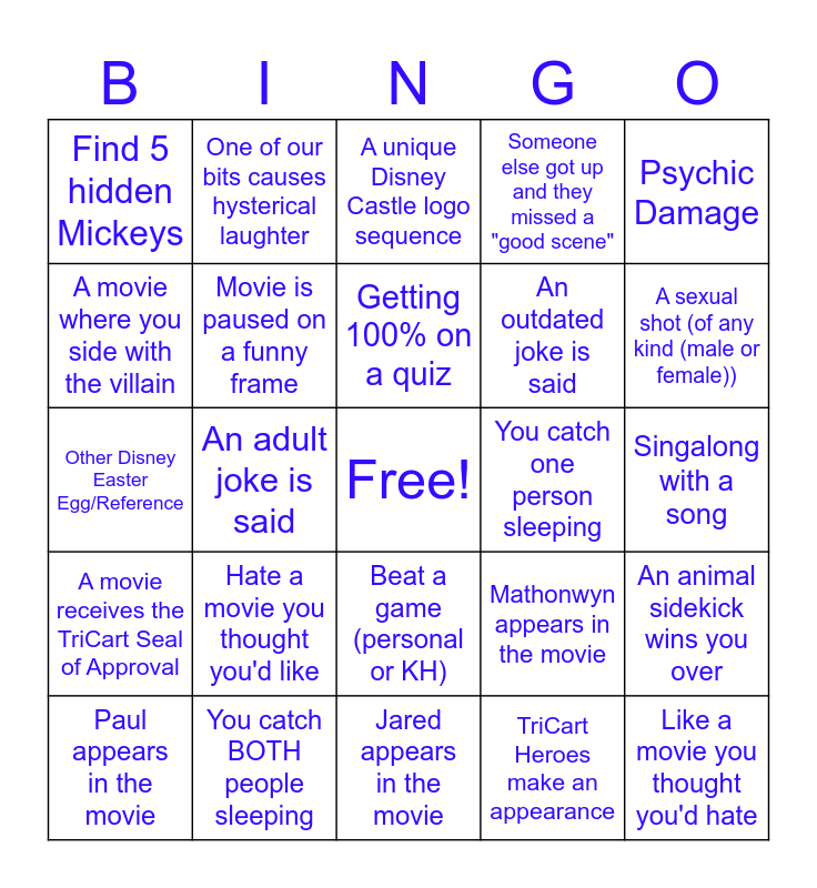 This bingo card has a free space and 24 words: Hate a movie you thought you'd like, You catch BOTH people sleeping, Getting 100% on a quiz, Paul appears in the movie, Psychic Damage, Find 5 hidden Mickeys, A movie where you side with the villain, One of our bits causes hysterical laughter, You catch one person sleeping, Beat a game (personal or KH), An outdated joke is said, Other Disney Easter Egg/Reference, Mathonwyn appears in the movie, An animal sidekick wins you over, Movie is paused on a funny frame, TriCart Heroes make an appearance, Singalong with a song, A unique Disney Castle logo sequence, A sexual shot (of any kind (male or female)), An adult joke is said, Like a movie you thought you'd hate, A movie receives the TriCart Seal of Approval, Someone else got up and they missed a "good scene" and Jared appears in the movie.