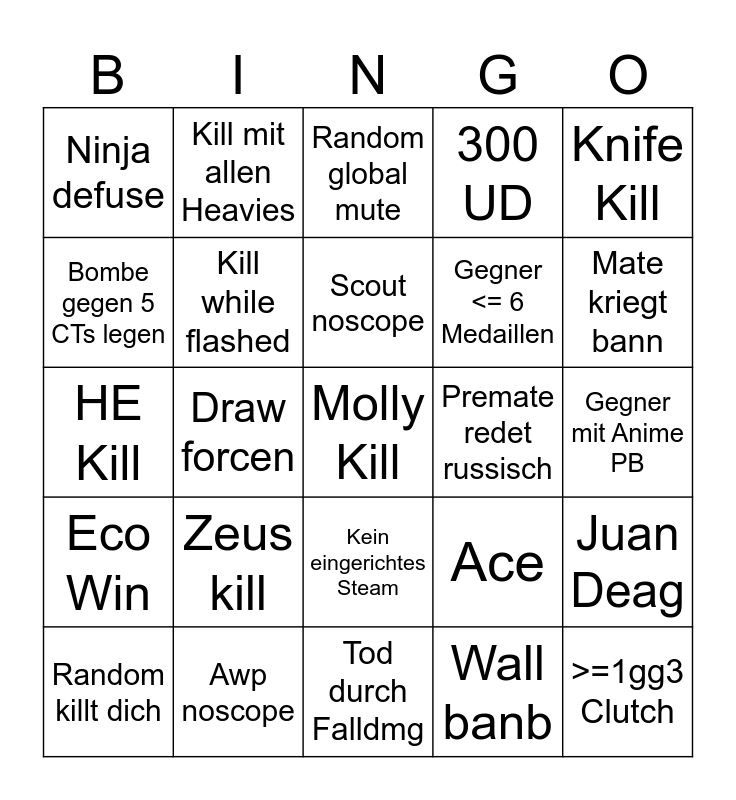 This bingo card has a free space and 24 words: Zeus kill, Awp noscope, Scout noscope, Random killt dich, Knife Kill, Ninja defuse, Bombe gegen 5 CTs legen, Kill mit allen Heavies, Premate redet russisch, Kein eingerichtes Steam, Gegner <= 6 Medaillen, HE Kill, Ace, Juan Deag, Kill while flashed, Wall banb, Gegner mit Anime PB, Random global mute, Mate kriegt bann, Draw forcen, >=1gg3 Clutch, Eco Win, 300 UD and Tod durch Falldmg.
